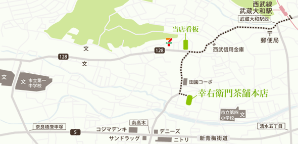幸右衛門茶舗本店は、東京狭山の茶畑と製茶工場、茶文化の伝統を伝える日本家屋等が隣接した、宮鍋製茶本社と同じ敷地内にあります。お客様がお寛ぎできるスペースを準備して、皆様のご来店をお待ちしております。